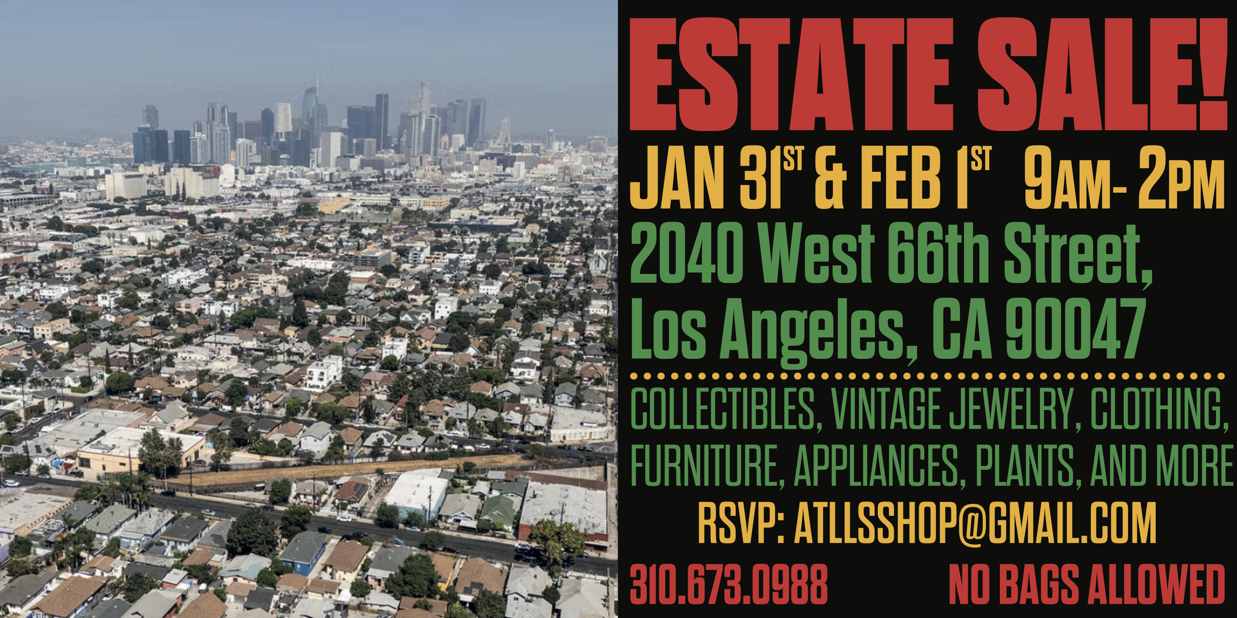 West 66th Street Estate Sale - Day II Sunday, February 1, 2026 9:00 AM 2:00 PM 09:00 14:00 West 66th Street Estate Sale 2040 West 66th Street Los Angeles, CA, 90047 United States (map) Google Calendar ICS West 66th Street Estate Sale - Day IIJan 31 & Feb 1, 20269am - 2pmCOLLECTIBLES, VINTAGE JEWELRY, CLOTHING, FURNITURE, APPLIANCES, PLANTS, AND MORE2040 W. 66th Street, Los Angeles, CA 90047 For more info:(310) 673-0988atllsshop@gmail.com